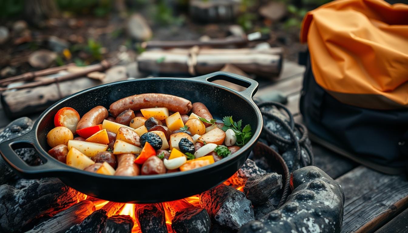 A durable cast iron skillet is key. Look for brands like Lodge and Le Creuset. Also, get some camping food ideas to spark your creativity.