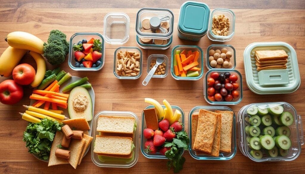 Batch cooking on weekends is a big help. Prepare fruits, veggies, proteins, and grains ahead. This makes packing lunches easy during the week.